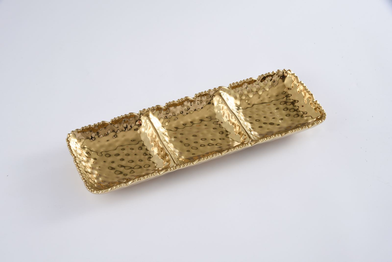3 Section Serving Tray in Golden Millennium. Get creative! This piece is great for serving different combinations of munchies, dips, and vegetables or all your Tex-Mex needs like guacamole, sour cream and pico de gallo. Striking and elegant gold titanium finished high-fired porcelain. Food safe. Dishwasher safe. Oven safe to 500°. Easy Care.