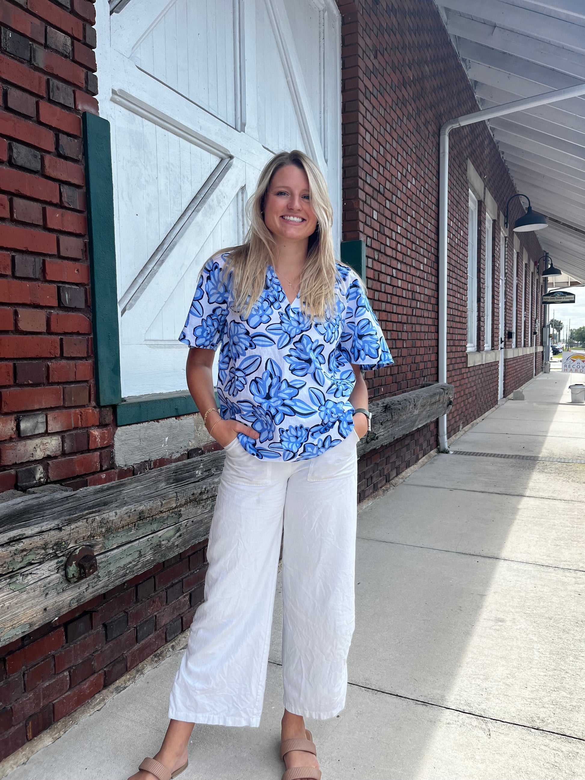 This women's Anderson Blue Top is crafted from cotton cambric fabric, ensuring a comfortable and breathable wear. Its V-neckline and oversized short flutter sleeves add a trendy and feminine touch. With its boxy fit, this top offers both comfort and a relaxed silhouette. Measuring approximately 26" from shoulder to hem, it boasts a versatile length.