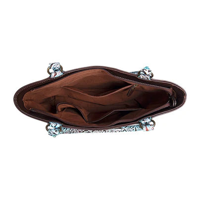 This beautiful bag offers a wonderful combination of elements. It features a beautiful turquoise hand-tooled leather accents which frame the hair-on hide perfectly. A front zippered pocket adds convenience. Zipper-close top. Matching leather carrying handles complete the great look.