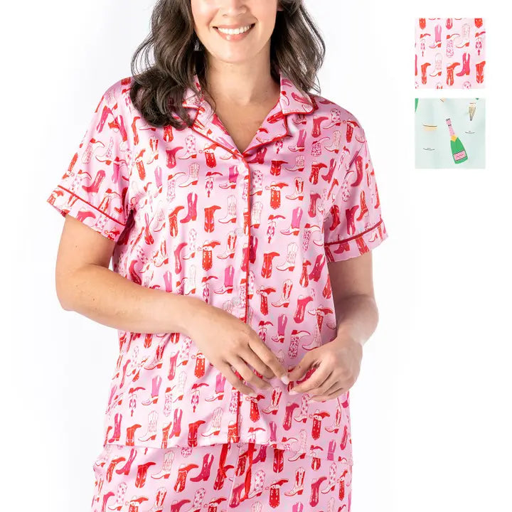 Snooze luxuriously in a super soft top made for true beauty sleep! Silky satin is gentle on skin and hair, minimizing dryness, frizz and knots. Available in two fun prints perfect for bachelorette/bridal gifts and treat-yourself purchases. Super soft, silky fabric Classic button-down style Breathable, relaxed fit Piping detail Machine washable