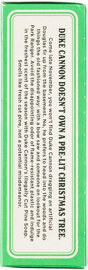 Avoid the sad stench of artificial flame retardant and indulge in the freshest scent of the season with Duke Cannon’s Illegally Cut Pine Soap. This large, 10 oz. soap features an invigorating aroma inspired by the fresh scent of Illegally Cut Pine, a practice we wholeheartedly discourage but imagine smells pretty nice. Avoid the misdemeanor trespassing charge and embrace the freshest scent of the season.