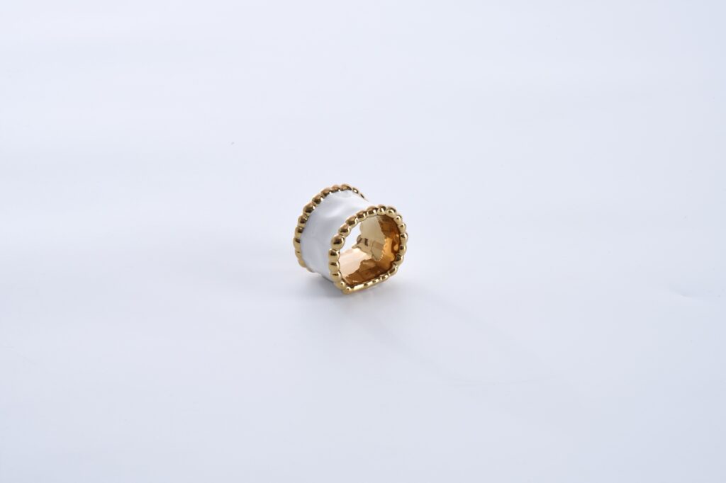 Set of 4 Napkin Rings in Golden Salerno. Tastefully traditional napkin rings bring an elegant shine to your table setting.? Adds the perfect finishing touch to a thoughtfully set table. High-fired white porcelain with lustrous gold beads in titanium.? Food safe. Dishwasher safe. Oven safe to 500°. Easy Care.
