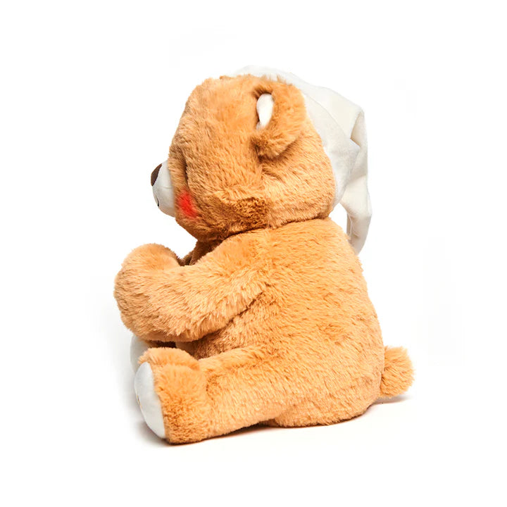Paws for Prayer Bear wears a cream colored nightcap and features an embroidered golden cross on their foot.