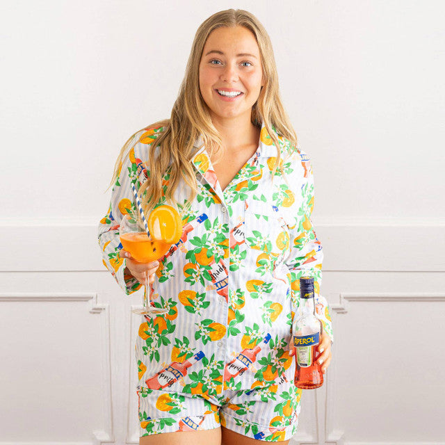 Sleep in style with our Apéritif Stripe Pajama Set. Crafted from 100% woven cotton, this set is designed to keep you comfortable so you can make the most of your rest. This elegant short set features a button-front long sleeve top & drawstring waist shorts with the orange blossom & Aperol spritz print, making it the perfect choice for any occasion, especially vacation. Slip into your own piece of elegance with our Apéritif Stripe Pajama Set today! Amazing gifts for birthdays, graduation, housewarming, Christmas, Mother's Day, Valentine's Day, Easter & many more special occasions!