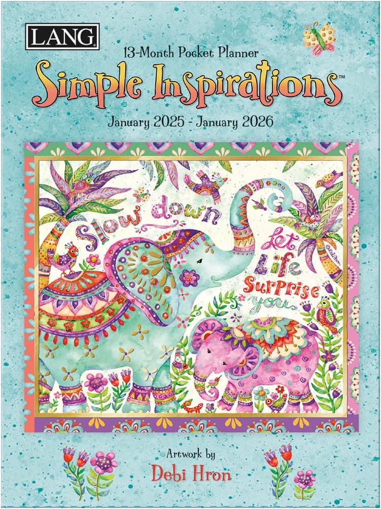 The 2025 Simple Inspirations Monthly Pocket Planner features whimsical characters and inspirational phrases by famous authors and poets with artwork by Debi Hron in a 13-month portable format that fits in any pocket or purse.
