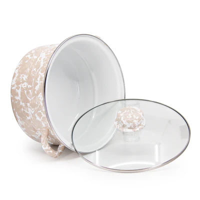 This enamelware is made of carbon steel coated with a porcelain enamel and trimmed in stainless steel. There will be variations in the shading of colors and pattern formations which are the results of the hand-dipped process.