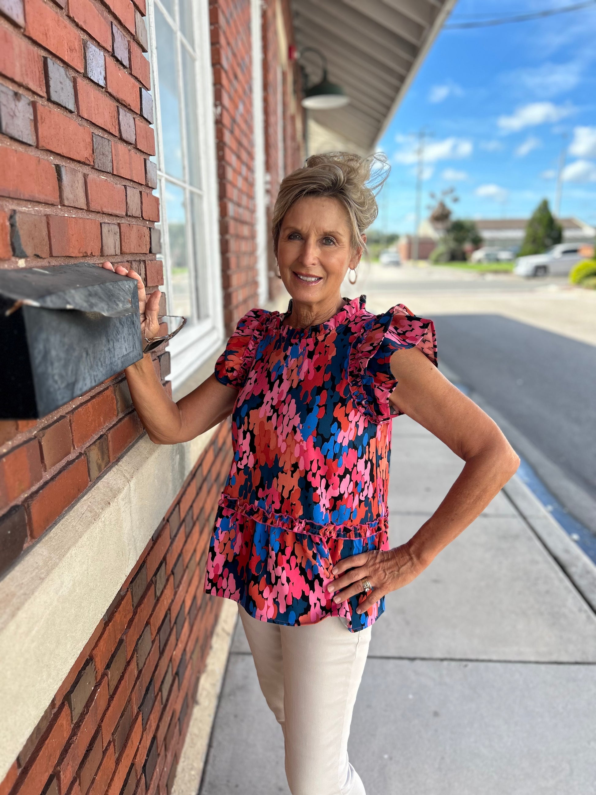 The Woody Flounce Top is a stunning piece made from heavy weight polyester. It boasts layer ruffle short sleeves, a ruffle high-neck, and a peplum flounce waist, adding a touch of elegance to any outfit. With a length of approximately 26" from shoulder to hem on size small, this top is designed to flatter your figure. Crafted from high-quality polyester, it offers both comfort and durability. Perfect for both casual and formal occasions, the Woody Flounce Top is a versatile addition to your wardrobe.